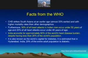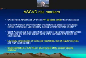 Dr. Vijay began by addressing the diaspora of South Asians around the world and the prevalence of atherosclerotic cardiovascular disease (ASCVD) which presents almost 20 years earlier in South Asian communities around the world, much earlier than in other ethnicities. He presented specific ASCVD risk factors such as smaller coronary artery diameter, high levels of lipoprotein (a), lower consumption of fruits and vegetables, and others in SAUS.